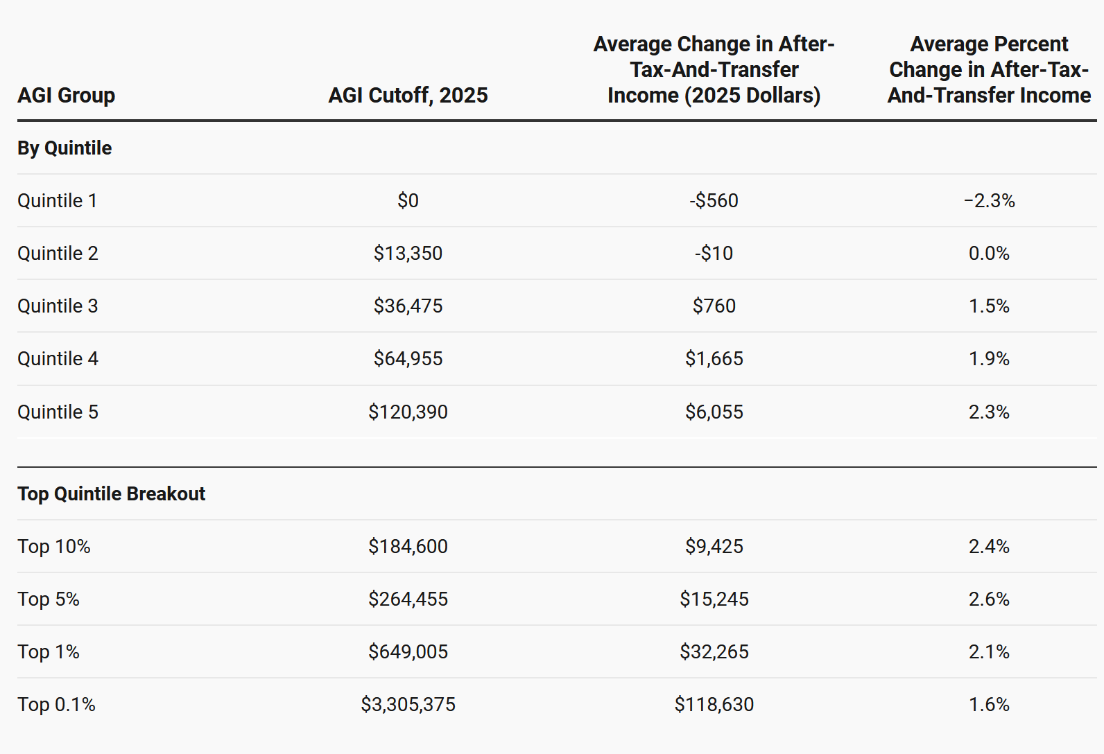 (Credit: Yale Budget Review: Average change in income from 2026-2034 for Americans, separated by quintiles of income. Net change in income calculated after reductions to food stamps and Medicaid)